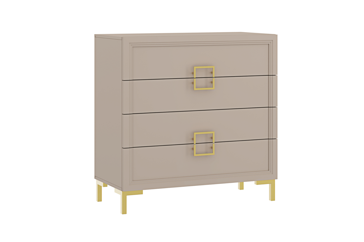 Элегантный лаконичный комод с четкими прямыми линиями будет превосходно смотреться в спальне, гостиной, прихожей, оформленной в стиле ар-деко или минимализм. Четыре выдвижных ящика визуально объединены рисунком квадратных ручек. Изящный сложный оттенок «серый кашемир», фурнитура и опоры «под золото» только усиливают эффектность мебели.